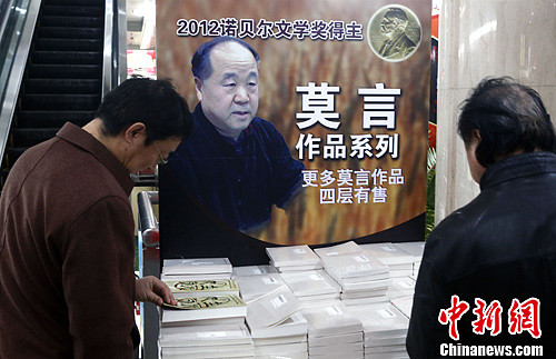 11月5日,两位北京市民在王府井书店最新版莫言全集专柜翻看图书,该全集在10月底新近上市。中新社发 张浩 摄