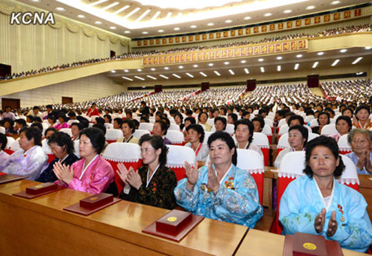 据朝中社11月14日的照片,前来平壤参加第四次全国母亲大会的代表获得表彰。图片来源:朝中社