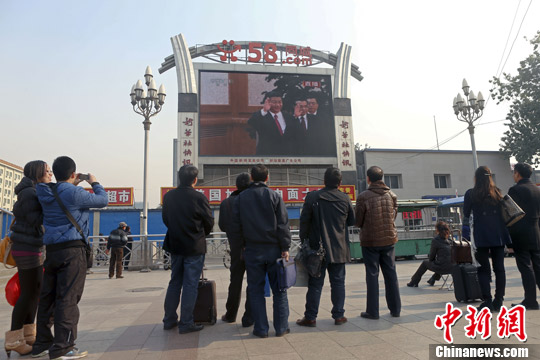 当天,新当选的中共中央总书记习近平和中共中央政治局常委李克强、张德江、俞正声、刘云山、王岐山、张高丽在北京人民大会堂与中外记者见面。