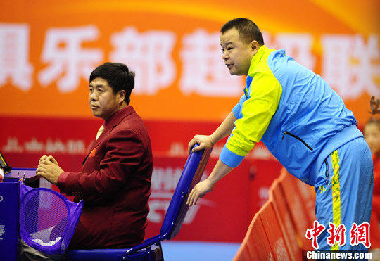 11月14日,中国乒乓球超级联赛迎来第二阶段第一轮较量。图为八一队主教练与当值裁判进行沟通。中新社发 崔楠 摄