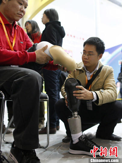 11月15日,2012年中国国际福祉博览会在中国国际展览中心举办,共有16个国家和地区240余家单位参展。图为工作人员现场为肢残人调试假肢。中新社发 富田 摄