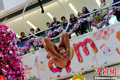 11月15日,马戏杂技巨星MariaMargiyeva在空中做出旋转等高难度动作。临近圣诞节。香港apm商场邀请了世界级马戏杂技巨星MariaMargiyeva作亚洲公开首演。中新社发 谭达明 摄