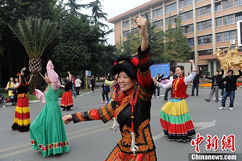 成都大学生穿民族服跳“骑马舞”