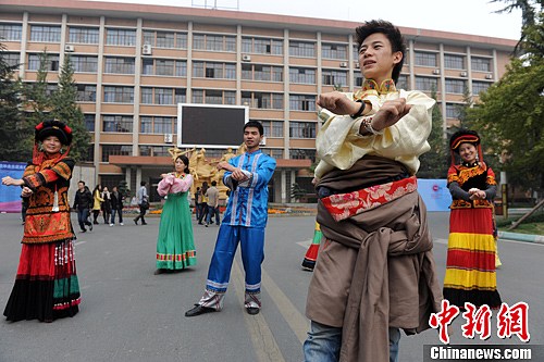 11月15日,西南民族大学校园内一群少数民族学生,穿戴民族服饰跳起了“骑马舞”,引来师生围观。中新社发 张浪 摄