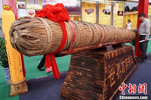 11月15日,在广西南宁开幕的第二届中国(南宁)国际茶业茶文化博览会上,商家展示炮状的“世界万两茶王”,抢夺观众眼球。此届茶博会吸引了来自福建、云南、湖南、西藏以及广西等多个省区的300多家大小茶企参展。中新社发 王刚 摄