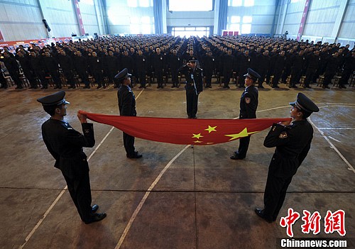 图为872名新录用狱警面对国旗庄严宣誓,将恪尽职守不辱使命。中新社发 刘新 摄