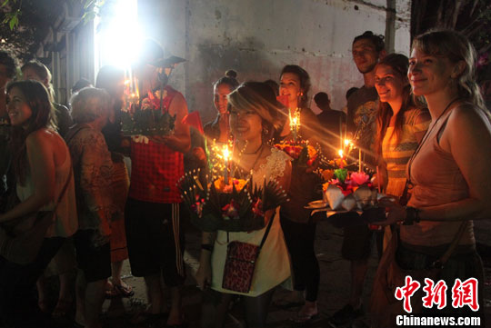 图为曼谷青年与外国游客一起在繁华桥旁的小溪边放水灯。余显伦 摄