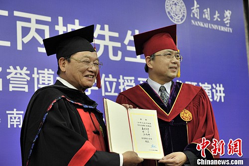 11月29日,台湾海基会前董事长江丙坤(左)荣获天津南开大学颁授的名誉博士学位。中新社发 郭晓帆 摄