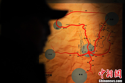 11月29日,“古道留痕——一个人的收藏”茶马古道文化展览正在云南民族博物馆展出。图为一幅介绍茶马古道路线的图片。中新社发 刘冉阳 摄
