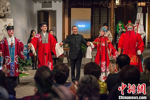 著名作曲家谭盾创作并导演的中国16世纪著名昆曲《牡丹亭》11月30日在纽约大都会博物馆艾斯特庭院隆重上演。中新社发 Stephanie Berger 摄