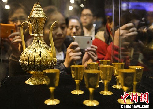 12月1日,福运长久龙执壶与故宫九龙金酒杯两者组成的一套纯金酒具《福运长久》在第八届北京国际金融博览会上首发。图为纯金酒具《福运长久》吸引众多参观者。中新社发 赵隽 摄