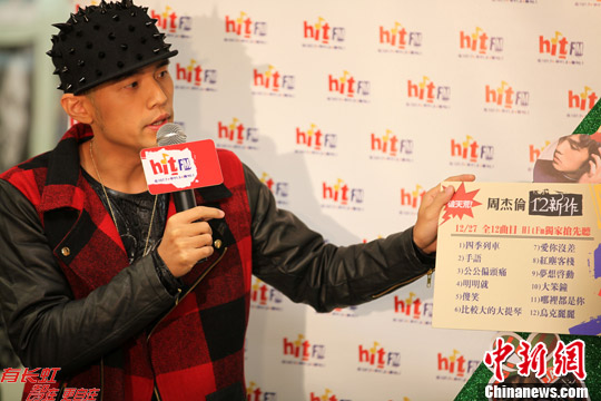 12月24日圣诞节前夕,台湾著名歌手、“亚洲流行天王”周杰伦身着红色外套,在台北出席记者会。图为周杰伦介绍个人第12张音乐专辑所收录12首新歌的歌名。中新社发 董会峰 摄