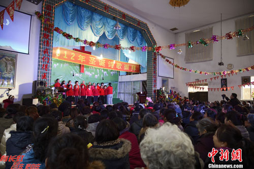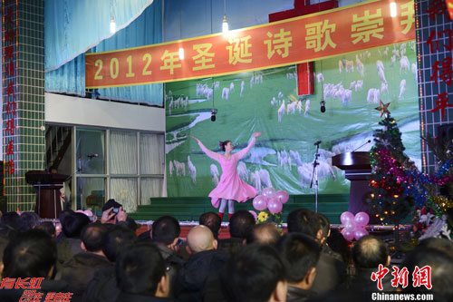 图为呼和浩特一基督教堂,信徒正表演“圣诞节”的节目。中新社发 刘文华 摄