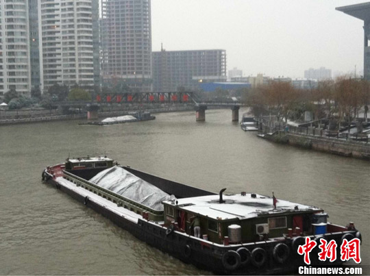 1月3日,浙江迎来了2013年第一场雪。图为杭州武林门码头的游轮披上“雪衣”。中新社发 罗雅迪 摄