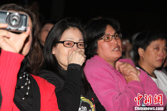 1月3日,台湾“帽子歌后”凤飞飞病逝满一周年,来自世界各地的“凤迷”齐聚台湾,以各种方式追思“凤姐”。图为3日台北,女歌迷参加“凤飞飞纪念音乐会”记者会,看着大屏幕播放凤飞飞生前最后一次站上舞台、与歌迷相约到白首的画面泪流满面。中新社发 董会峰 摄