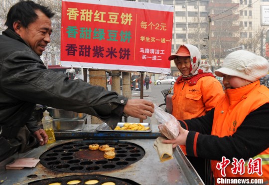1月7日,在严寒的冬日,被网友称为“豆饼哥”的河北赞皇县农民姚彦军,正将三个热乎乎的红豆饼送给一位年轻的环卫女工。姚彦军出售豆饼温暖了很多人的心,他坚持给学生买一赠一,清洁工买一赠二,其事迹被网友称为向社会传递正能量。中新社发 翟羽佳 摄