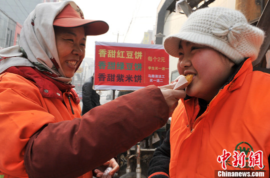 图为下班后,环卫女工一起品尝红豆饼。 中新社发 翟羽佳 摄