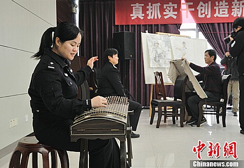 图为女民警弹奏古筝为活动助兴。中新社发 甘勇 摄