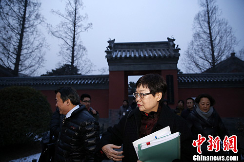1月22日,“2013年两岸故宫交流记者会”之后,台北故宫院长冯明珠走出北京故宫的会场。中新社发 刘关关 摄