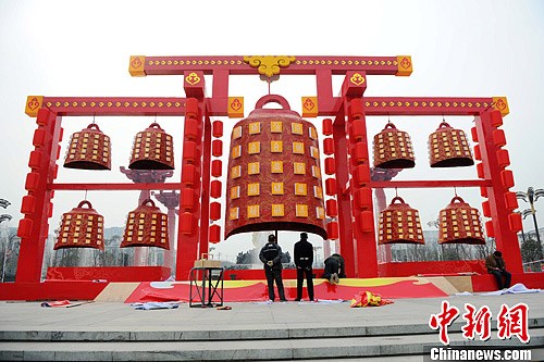 28日,一座高约10米的巨型“编钟”亮相西安市大唐不夜城,吸引了不少游人驻足参观。随着春节临近,西安街头的年味也越来越浓。图为巨型“编钟”。张远 摄