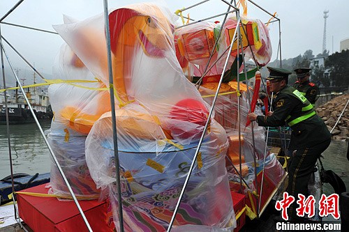 2月6日,3181盏分别来自福州马尾、连江、长乐、罗源等地的各式花灯,在福建连江县黄岐港边防人员协助下装船运往马祖,将参加2013年第十一届“两马同春闹元宵”活动。此外,今年首次在马祖举办两马同春摄影展,展板也于当日在黄岐港一同启运。中新社发 吕明 摄