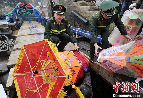 2月6日,3181盏分别来自福州马尾、连江、长乐、罗源等地的各式花灯,在福建连江县黄岐港边防人员协助下装船运往马祖,将参加2013年第十一届“两马同春闹元宵”活动。此外,今年首次在马祖举办两马同春摄影展,展板也于当日在黄岐港一同启运。中新社发 吕明 摄