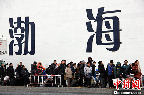渤海湾烟台至大连航线6日迎来春运首个旅客高峰。自5日中午12点至6日中午12点,该航线往来旅客近23000人次。渤海湾烟台至大连航线是连接中国华东地区与东北三省的“黄金水道”。王娇妮 摄