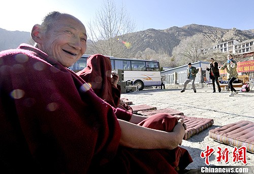 2月5日,拉萨哲蚌寺僧人正在观看西藏话剧团表演的小品。2013年藏历水蛇新年临近,西藏自治区话剧团来到哲蚌寺慰问演出。中新社发 李林 摄