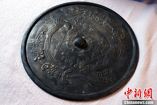 其中精美的唐代鹦鹉衔绶镜实属罕见。镜面上一对鹦鹉首尾相对,双翅舞动,拖着细长的尾羽,各衔一结满花叶的长绶。中新社发 汤彦俊 摄