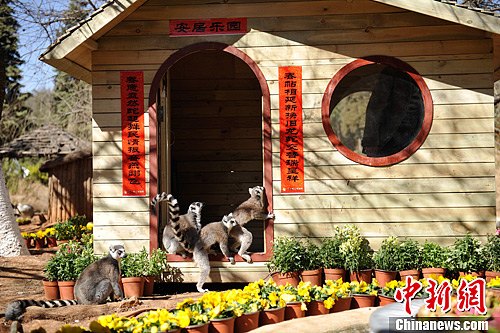 图为2月6日,首批登岛进行适应性评估的狐猴在岛上的“别墅”前玩耍。中新社发 刘冉阳 摄