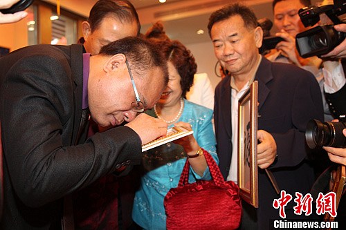 2月6日,中国驻泰国大使馆在曼谷中国文化中心举办2013年“开门过大年”迎新春活动。图为泰国国会主席颂萨在观看微雕作品。中新社发 余显伦 摄