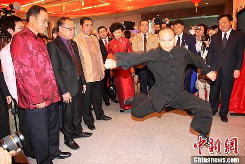 2月6日,中国驻泰国大使馆在曼谷中国文化中心举办2013年“开门过大年”迎新春活动。泰国国会主席颂萨(左二)、泰国文化部长颂他耶(左三),在中国驻泰大使管木(左一)陪同下,观看中国武术表演。中新社发 余显伦 摄