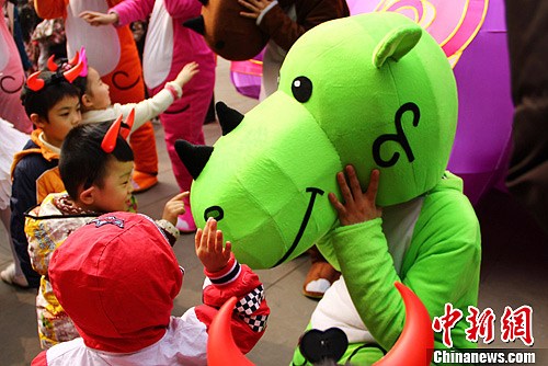 2月6日,成都金沙遗址博物馆举行天府广场石兽亮相活动。该博物馆对外征集的40名“瑞牛宝宝”在活动现场集体亮相,瑞牛宝宝们头戴牛角装饰,手拿瑞兽模型气球,跟着牛型人偶的动作舞动起来,为成都金沙太阳节增添别样风采。