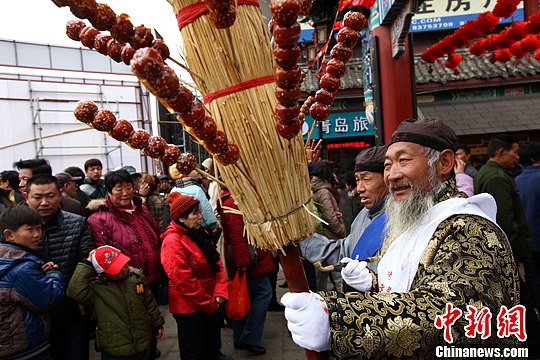 2月25日,蛇年正月十六,在2013青岛海云庵糖球会开街仪式上,演员们扭秧歌、踩高跷、卖糖球、扮货郎等依依亮相,以穿越青岛百年、演绎民俗风情的形式拉开了糖球会的帷幕。中新社发 徐崇德 摄