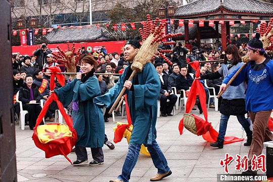 2月25日,蛇年正月十六,在2013青岛海云庵糖球会开街仪式上,演员们扭秧歌、踩高跷、卖糖球、扮货郎等依依亮相,以穿越青岛百年、演绎民俗风情的形式拉开了糖球会的帷幕。中新社发 徐崇德 摄
