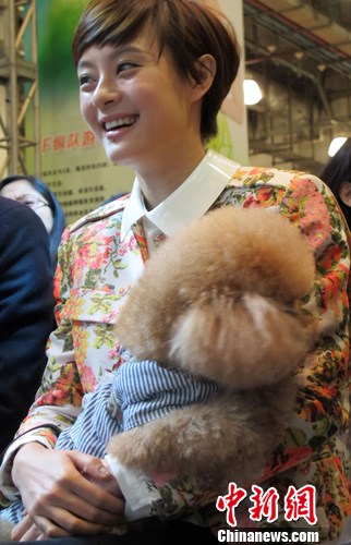 3月3日,中国热播宫廷情感剧《甄嬛传》主演孙俪携自家7岁的泰迪犬,现身上海宠物大会。郑莹莹 摄