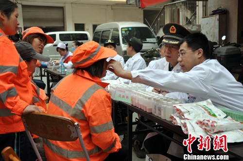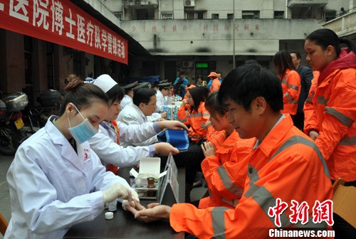 3月5日学雷锋日,解放军303医院组织博士医疗队为广西南宁市环卫工人义诊送药。今年是毛泽东“向雷锋同志学习”题词发表50周年,中国各地开展形式多样的学雷锋献爱心活动。中新社发 黄艳梅 摄