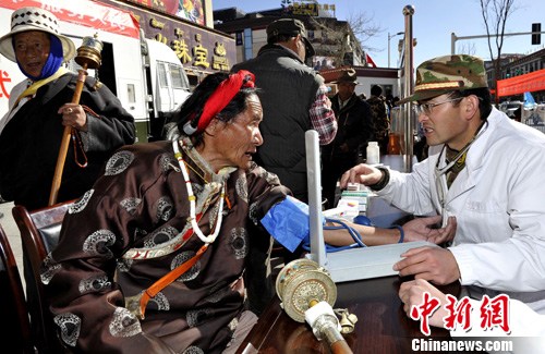 图为武警西藏总队的军医正在给多吉(图左)测量血压。中新社发 李林 摄