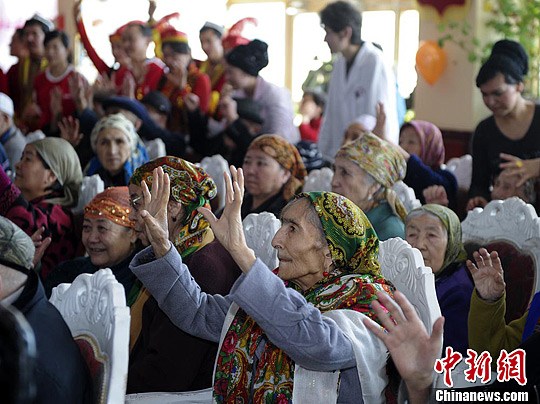 老人们在志愿者的带动下,举起手舞起“健手操”。刘新 摄