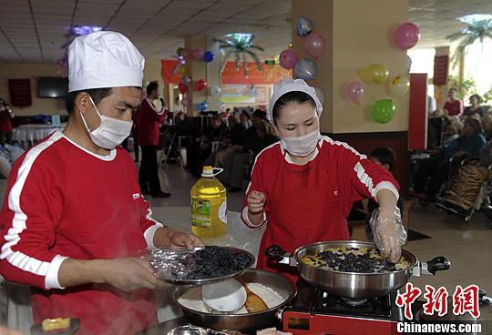 志愿者现场为老人烹饪新疆美食——抓饭。刘新 摄