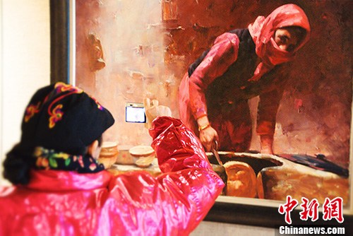 作品描绘了一位新疆妇女正在劳动。图为参观者正在给作品拍照。马新龙 摄
