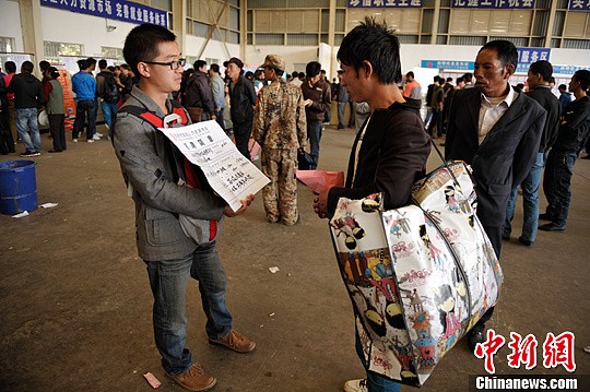 3月6日,昆明南坝人力资源市场内,挤满了前来求职和招聘的人员,许多招聘企业发愁找不到合适的员工,求职者也抱怨找不到合适的工作。中新社发 刘冉阳 摄