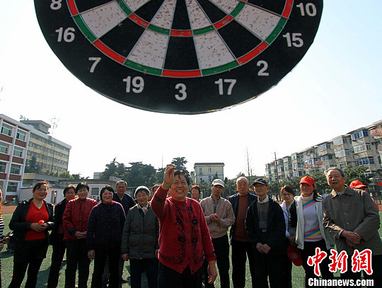 3月6日,安徽省合肥市气温高达23度,银河湾社区的老人们在阳光明媚的春天里开展趣味运动会,享受春天的到来。图为老人们在进行掷飞镖游戏。中新社发 韩苏原 摄