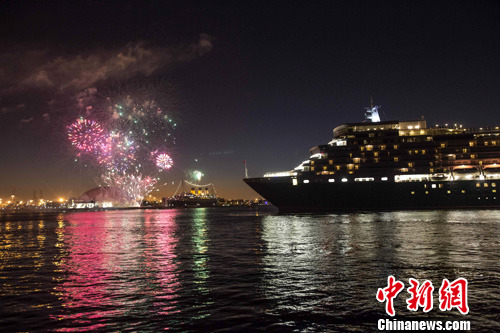 当地时间3月12日晚,美国加州长滩港庆祝皇家邮轮伊丽莎白女王号与玛丽王后号首次历史会合,举行盛大烟花汇演。中新社发 林戈 摄