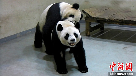 三月,是赠台大熊猫团团、圆圆的最佳繁殖时间。台北市立动物园19日上午尝试让大猫熊团团、圆圆二度“洞房”仍失败,因此下午帮圆圆进行第3次人工授精。图为团团、圆圆自然交配。中新社发 台北市立动物园 供图
