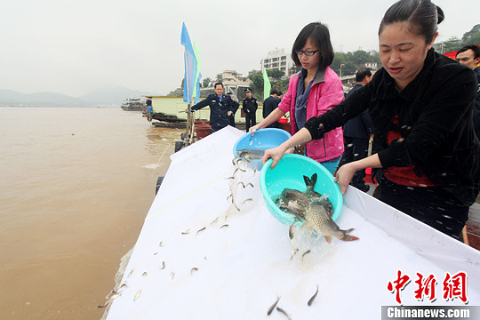4月1日,2013年珠江云浮段禁渔启动暨增殖放流仪式在广东云安县六都镇港航码头举行,800万尾鱼苗被放入西江。中新社发 黄耀辉 摄