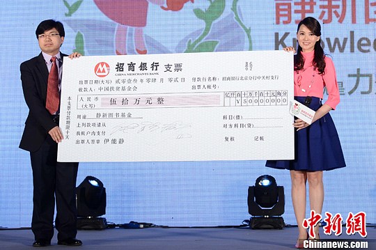 4月2日,由伊能静工作室和中国扶贫基金会共同发起的静新图书基金在北京举行启动仪式。伊能静在启动仪式上为静新图书基金捐出首笔善款50万元人民币,并分享了创立此项基金的缘起过程。中新社发 李学仕 摄