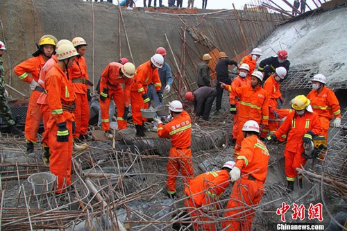 截至2日晚21时20分,2名遇难工人遗体被发现,仍有1人被埋。中新社发 章肖 摄