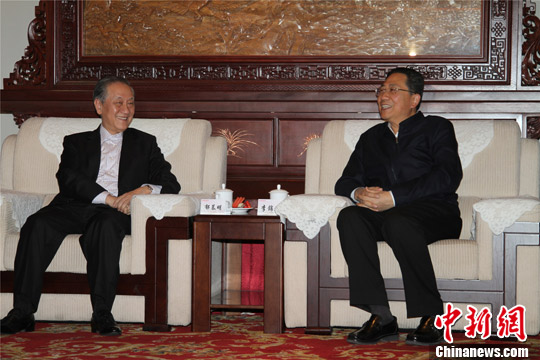 图为台湾新党主席郁慕明与中共陕西省委常委、组织部部长李锦斌交谈 。冀浩凡 摄