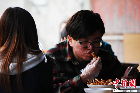 一位游人正在吃卤鸡爪,桌上的盘子里还有数只卤鸡爪没吃完。 吴瞳 摄